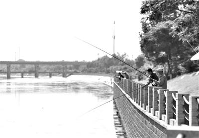 昨日,北京海淀区上清桥附近,市民在清河边钓鱼。记者 王叔坤摄