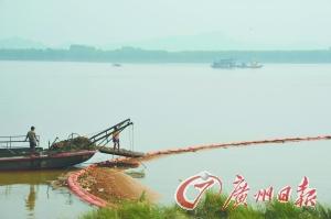 昨天,清远市民发现北江清城七星岗水厂附近的江面上出现长长的漂浮围栏,有清洁人员从其中捞出成堆的油泥和垃圾杂物。