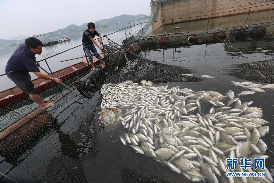 9月7日晚,湖南水庙府水库双峰县水域的养殖户发现网箱中的鱼出现不正常死亡现象,至9月8日,死亡的各类鱼达数万条。目前,娄底市和双峰县的环保部门已经派工作人员在现场对水样进行了取证。水府庙水库地处湖南省娄底市双峰县、娄星区、湘乡市三地交界,为湖南省水利厅直属的大型水库。水库是娄底市城区生活用水水源,也是长沙、株洲、湘潭(长株潭)地区备用水源。新华社发(郭国权 摄)