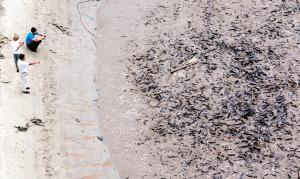 9月10日,海口市相关部门将问题鱼塘抽干,大量“垃圾鱼”现身。 本报记者 李英挺 摄