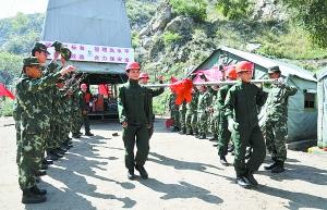 武警黄金第二支队官兵从钻机上取出最后一根岩芯(9月11日摄)。