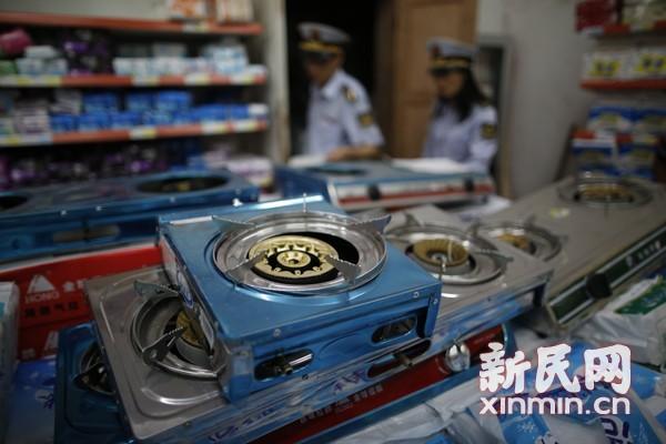 图说:执法人员现场没收了十余台各种品牌的燃气灶。新民网 记者萧君玮 摄