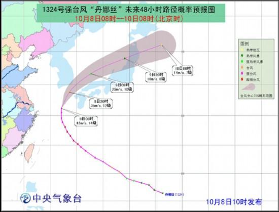参与互动(0)中央气象台10月8日10时发布台风蓝色预警:今年第24号强台风“丹娜丝”的中心今天上午8点钟位于我国浙江省舟山市东偏北方大约490公里的东海北部海面上,就是北纬31.2度、东经127.1度,中心附近最大风力有14级(42米/秒),中心最低气压为955百帕,7级风圈半径330公里,10级风圈半径130公里。