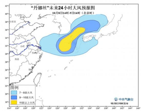 受冷空气和“丹娜丝”的共同影响,今天下午到明天上午,黄海南部、东海北部、长江口将有7-9级大风,其中东海东北部风力有10-11级,“丹娜丝”中心经过的附近海域风力可达12-14级。