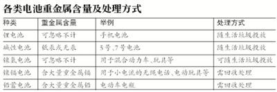 据专家介绍,目前常用电池,主要分为几种:锂电池、碱性电池(又名锌锰电池)、镍镉或镍氢电池、铅蓄电池。其中,对环境影响最大的主要是铅蓄电池、镍镉电池以及含汞的碱性锌锰电池。