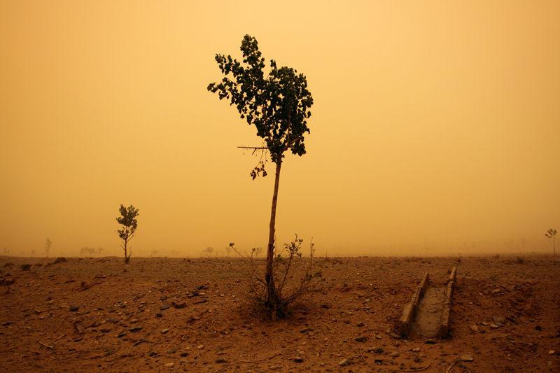 宁夏中部一场严重的沙尘暴使地面被橙黄色覆盖。春天刮风时,这种干的退化的表层土地很容易被吹起来。