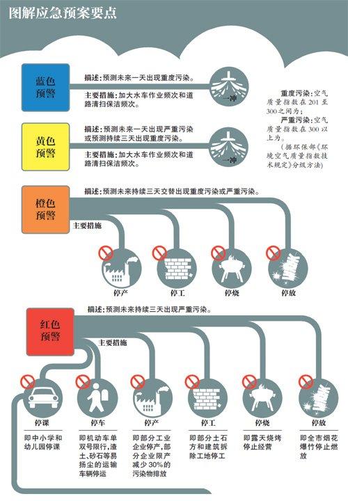《空气重污染日应急方案》启动,将重污染日分为重污染日、严重污染日和极重污染日三级。其中,当出现极重污染日时,三成公车将停驶。1月29日,随着污染天的加剧,市政府临时出台更加严格的大气污染应急减排措施。