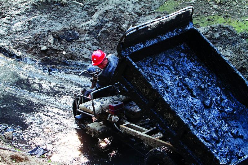 工人从缓坡上将淤泥“铲下”