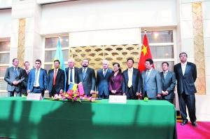 乌克兰第一副总理谢尔盖·阿尔布佐夫(左六)、姚燕(右五)、黄安中(左四)、王用生(右四)、戴春宁(右三)等出席签约仪式。