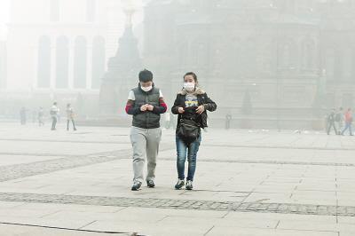 图为21日上午,哈市道里区建筑艺术广场两名市民戴口罩出行。文/摄 记者 程瑶