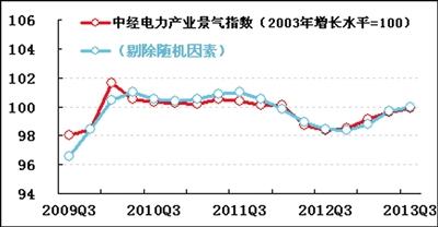 进一步剔除随机因素后,中经电力产业景气指数为100.0(见景气走势图中的蓝色曲线),比上季度上升0.3点,与未剔除随机因素的景气指数(见景气走势图中的红色曲线)基本吻合,说明政策调整等外部因素对电力行业的影响呈中性。