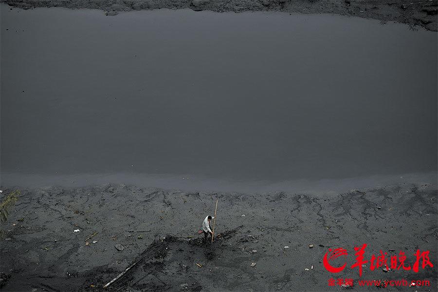 一位工人站在黑色的河水边清理散落在淤泥上的垃圾。图/王磊