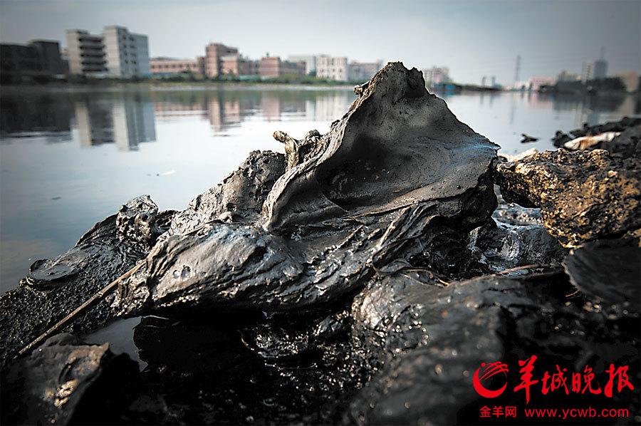 河边蚝壳被浸染成墨黑色。图片来源:羊城晚报