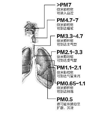 实验室课题组负责人、复旦大学公共卫生学院教授阚海东说,不同粒径的颗粒物在下呼吸道的沉积就像是做“折返跑”,PM0.5就像是呼吸管道里灵活的“老鼠”,可以沿着气流一直扩散到肺泡。