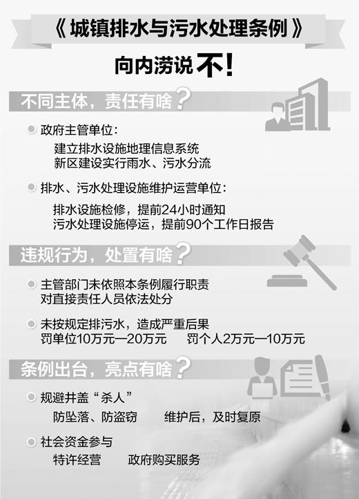 “《条例》是城镇排水与污水处理设施的‘护身符’。”张辰介绍,《条例》规定,城镇排水与污水处理设施维护运营单位应当加强对窨井盖等城镇排水与污水处理设施的日常巡查、维修和养护,保障设施安全运行。从事管网维护、应急排水、井下及有限空间作业的,设施维护运营单位应当安排专门人员进行现场安全管理,设置醒目警示标志,采取有效措施避免人员坠落、车辆陷落,并及时复原窨井盖。