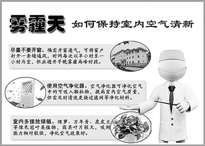 “防”就是预防呼吸道疾病。进入雾霾天气多发期后,呼吸道抵抗力下降,导致许多官兵患咽炎、鼻炎、支气管炎、哮喘等呼吸道疾病。其主要症状是咳嗽、鼻塞、胸闷、呼吸困难等,如果出现上述不适,应该及时就医,防止病情进一步发展。另外雾霾天气时,室内通风差,近地层紫外线照射强度减弱,使空气中传染性病菌的活性增强,易发生传染病,当发病人群相对集中时,应加强隔离。