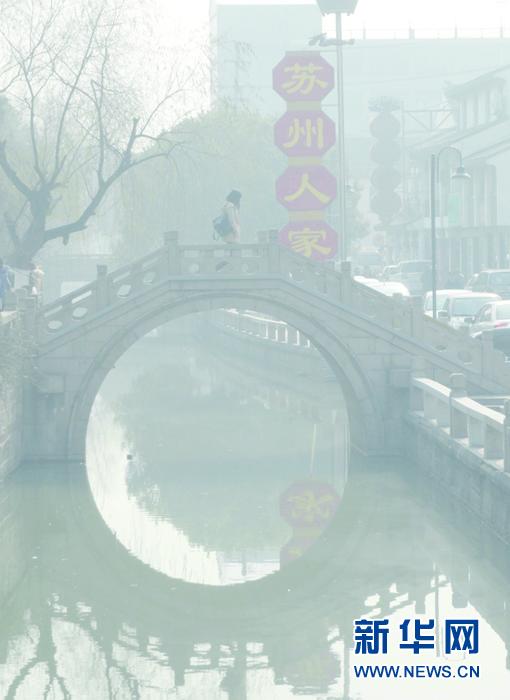 2013年1月12日,人们走在雾霾笼罩下的苏州临顿河小桥上。新华社稿