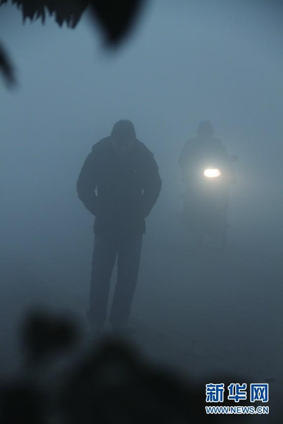 2013年1月28日,河南焦作武陟县街头,人们在大雾中出行。新华社 冯小敏 摄