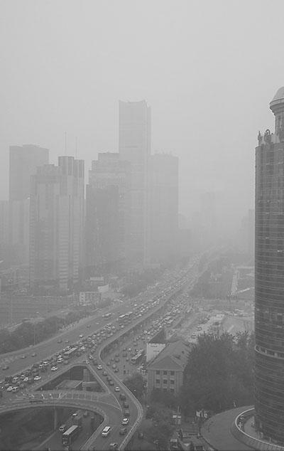 11月1日,北京东三环国贸桥周边的建筑隐没在雾霾中。新华社记者 罗晓光摄