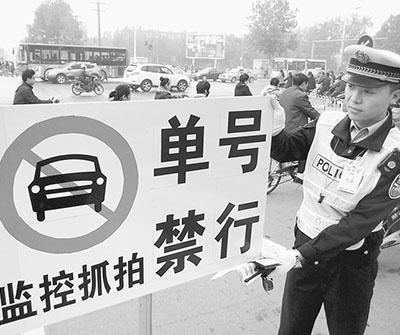在河北省邢台市民警正在摆放单双号限行标志牌。为妥善应对重污染天气,提高预警和应急能力,邢台在市区开展重污染天气机动车单双号限行应急演练。黄 涛 张 莉摄影报道
