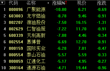 今日石油板块大幅走低,截至收盘板块整体跌幅超4%,广聚能源跌停,龙宇燃油跌8.78%,准油股份跌7.50%,仁智油服跌7.22%,天利高新跌7.08%,中国石油跌1.54%,中国石化跌1.68%。