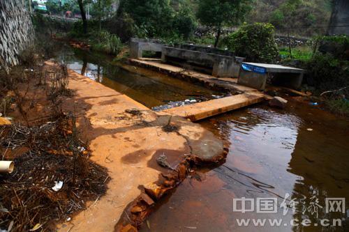 青山钢铁利用一条流过厂区的溪流排放酸性污水。(蒋毅坤/摄)