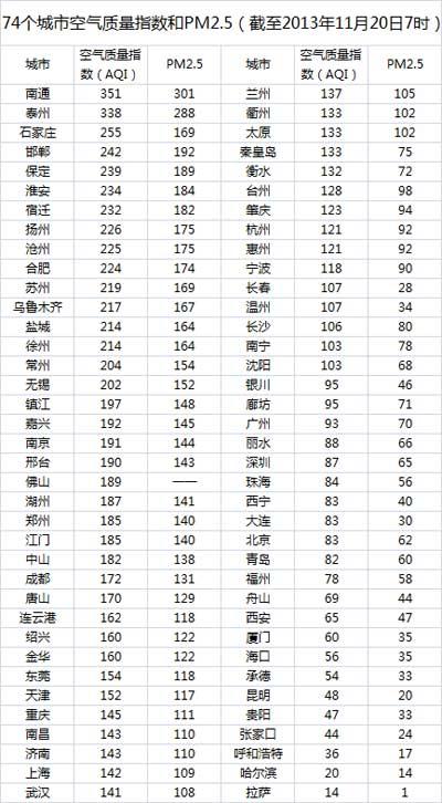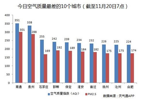 截至今日早上7时,南通的AQI(空气质量指数)达到351,属于严重污染,成为74个公布PM2.5数据城市中空气质量最差的城市。截至今日7时空气质量最差的10个城市分别为:南通、泰州、石家庄、邯郸、保定、淮安、宿迁、扬州、沧州和合肥。其中5个城市属于江苏省,4个城市属于河北省。