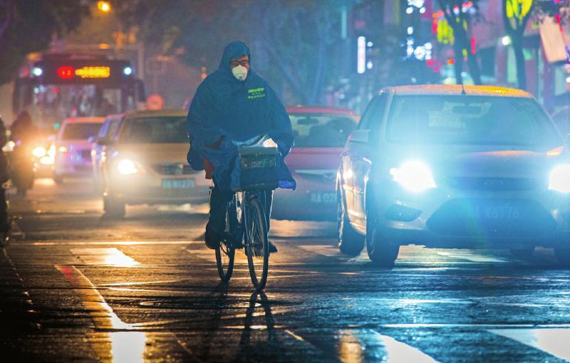 11月19日下午4点多,一名骑车男子戴着口罩穿行在成都“黑夜”中。谭曦 摄