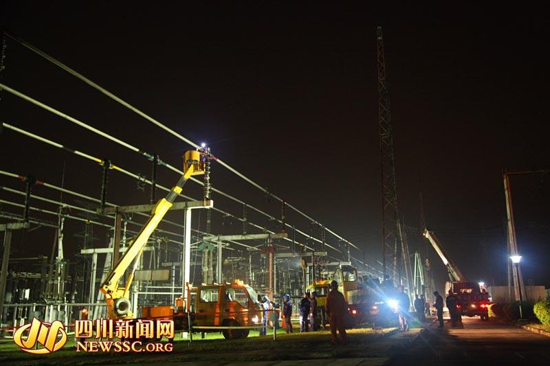 挑灯夜战抢修变电站。