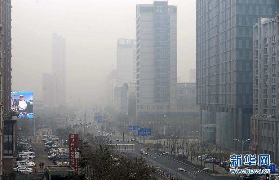 11月24日,沈阳街头被雾霾笼罩。当日,沈阳再次遭遇重度雾霾天气。14时30分,沈阳市环境空气质量实时发布系统显示最近一小时全市11个监测点位的PM2.5数值中,8个点位达到6级严重污染,2个点位达到5级重度污染,1个点位达4级中度污染级别。新华社记者 李钢 摄