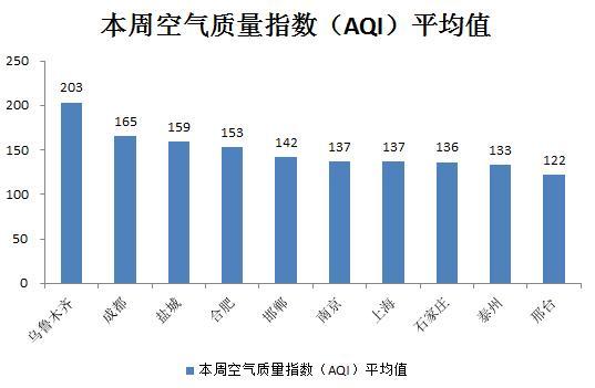 上周全国大部分地区空气质量较好,人民网环保频道据每日空气质量排行榜汇总统计出空气质量指数(AQI)平均值,上周空气质量最差的10个城市分别为:乌鲁木齐、成都、盐城、合肥、邯郸、南京、上海、石家庄、泰州和邢台。其中3个城市属于河北省,3个城市属于江苏省。