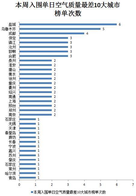 上周河北和江苏多城频繁现身空气质量单日最差十大城市排行榜,盐城6次上榜,乌鲁木齐5天上榜单日空气质量最差10大城市。(杨翼)