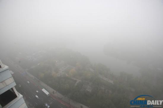 11月2日,济南遭受雾霾天气污染,能见度极低。俯瞰大明湖全景,如同“白纸”一张。(中国日报亚洲新闻图片网 郑涛 摄)