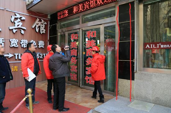 这是观门街口的和美宾馆,红线所标位置为天然气管道的垂直部分大致走向。该宾馆的门厅有六七米长,将天然气管道包覆不说,门厅里还有天然气设施排放烟筒,还布满了各种电线。本网记者崔永焘摄