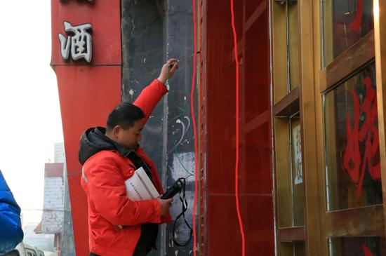 人民街的“西宁姥家”餐馆,为了将门面多开几十厘米,竟然将天然气管道及阀门完全包裹。红线所标位置为天然气管道的大致走向。本网记者崔永焘摄