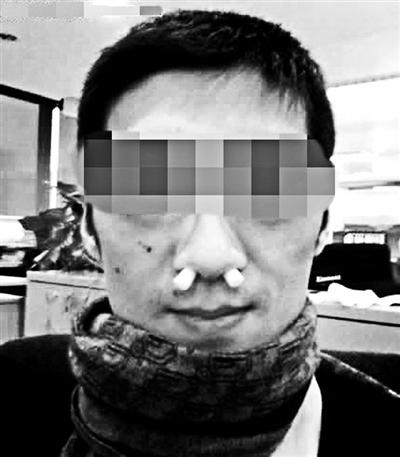 一名网友将两个过滤嘴塞进鼻孔
