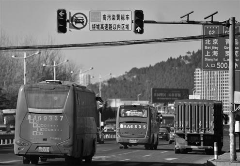 黄标车市区禁行的标志已在邢村立交桥东侧的经十路上安装就位 记者刘畅摄