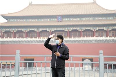 11月1日,北京大部分地区重度污染,一名游客戴着口罩在午门前挥手跟朋友打招呼。 实习生 王飞 摄