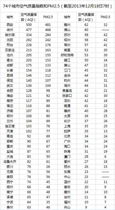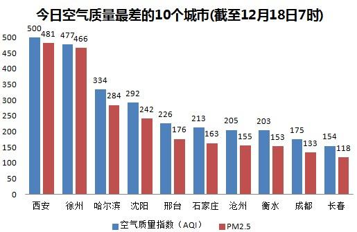 截至今天早上7时,西安的AQI(空气质量指数)“爆表”达到500,属于重度污染,成为74个公布PM2.5数据城市中空气质量最差的城市。今日空气质量最差的10个城市分别是西安、徐州、哈尔滨、沈阳、邢台、石家庄、沧州、衡水、成都和长春,其中邢台、石家庄、沧州、衡水等4个属于河北省,东三省分别有一个城市上榜。