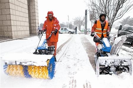 环卫工人使用不同类型的抛雪机清扫人行道。郭 熠摄