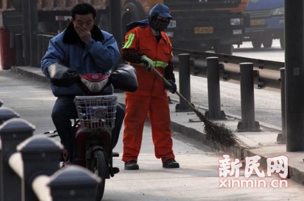 图说:今年末,申城雾霾天频现,图为环卫人员佩戴口罩作业。新民网记者 沈文林 摄