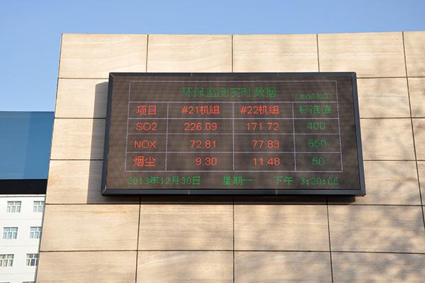 石家庄市区的河北华电石家庄热电有限公司大门前对公众公布的生产和环保数据。