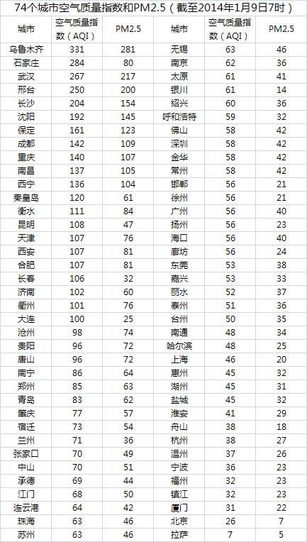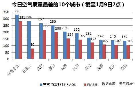 截至今日早上7时,乌鲁木齐的AQI(空气质量指数)达到331,属于六级严重污染,成为74个公布PM2.5数据城市中空气质量最差的两个城市。今日空气质量最差的10个城市分别是乌鲁木齐、石家庄、武汉、邢台、长沙、沈阳、保定、成都、重庆、南昌。其中石家庄、邢台、保定3个城市属于河北省。(蒋琪)