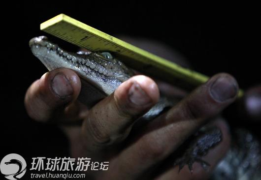 一位野生动物学家在夜晚捕捉到小鳄鱼并为它量体记录