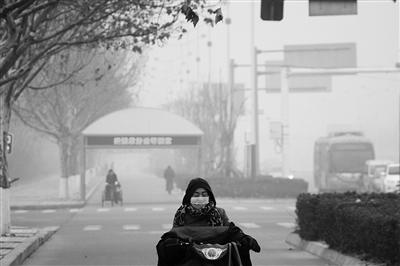 山东省气象台于1月7日8时40分将霾黄色预警信号升级为霾橙色预警信号。目前,菏泽、聊城、德州、济南、滨州、东营、淄博、潍坊8市出现了重度霾。图为市民在雾霾笼罩下的滨州市街头出行。