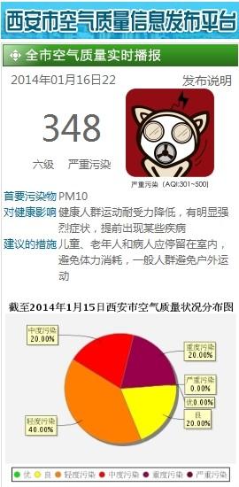 1月16日晚上22时,西安市空气质量指数为348,为六级严重污染,首要污染物为PM10。
