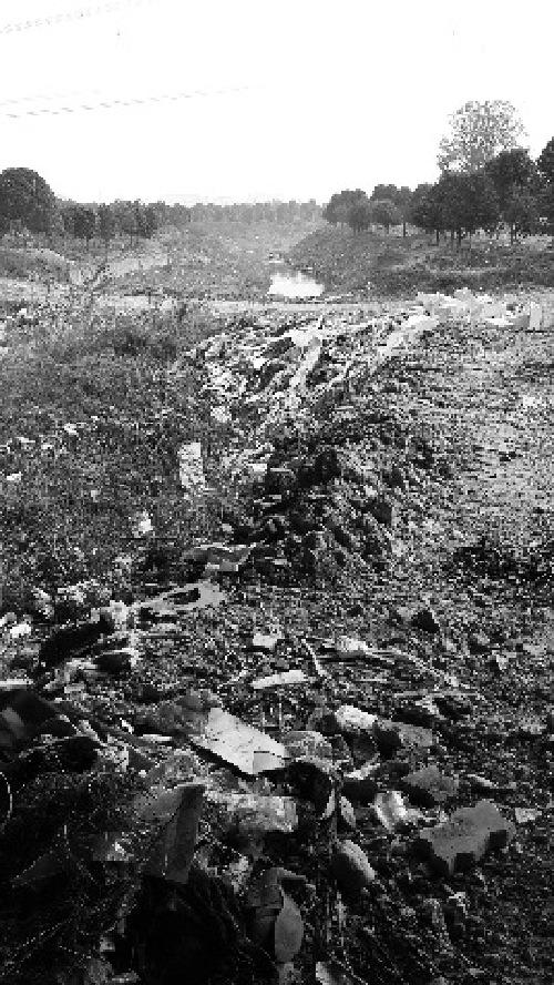记者用树枝翻开靠东侧的一处垃圾堆,一股刺鼻的油漆味扑面而来,5只曾装过白色油漆的油漆桶赫然在目。垃圾堆里还有海绵泡沫、幕布、墙纸、网兜、砖块、打折广告牌……