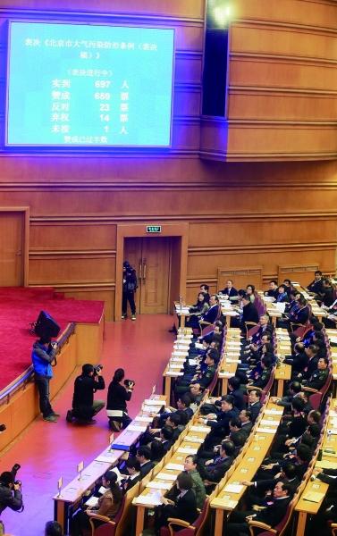 表决结果显示,《北京市大气污染防治条例》获659票赞成、23票反对、14票弃权、1人未按,赞成已过半数 摄/法制晚报记者 付丁