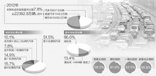 据介绍,我国机动车保有量持续增长。与2011年相比,全国机动车保有量增加了7.8%,达到22382.8万辆;其中,汽车10837.8万辆,低速汽车1145.0万辆,摩托车10400.0万辆。按排放标准分类,达到国Ⅳ及以上标准的汽车占10.1%,国Ⅲ标准的汽车占51.5%,国Ⅱ标准的汽车占15.7%,国Ⅰ标准的汽车占14.9%。其余7.8%的汽车还达不到国Ⅰ标准。按环保标志分类。绿标车占86.6%,高排放的黄标车仍占13.4%。