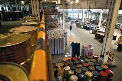 昨日,北京红狮漆业有限公司,值班工人在巡视停产的厂房。空气重污染橙色预警启动后,北京147家工业企业进行停产限产。记者 侯少卿 摄